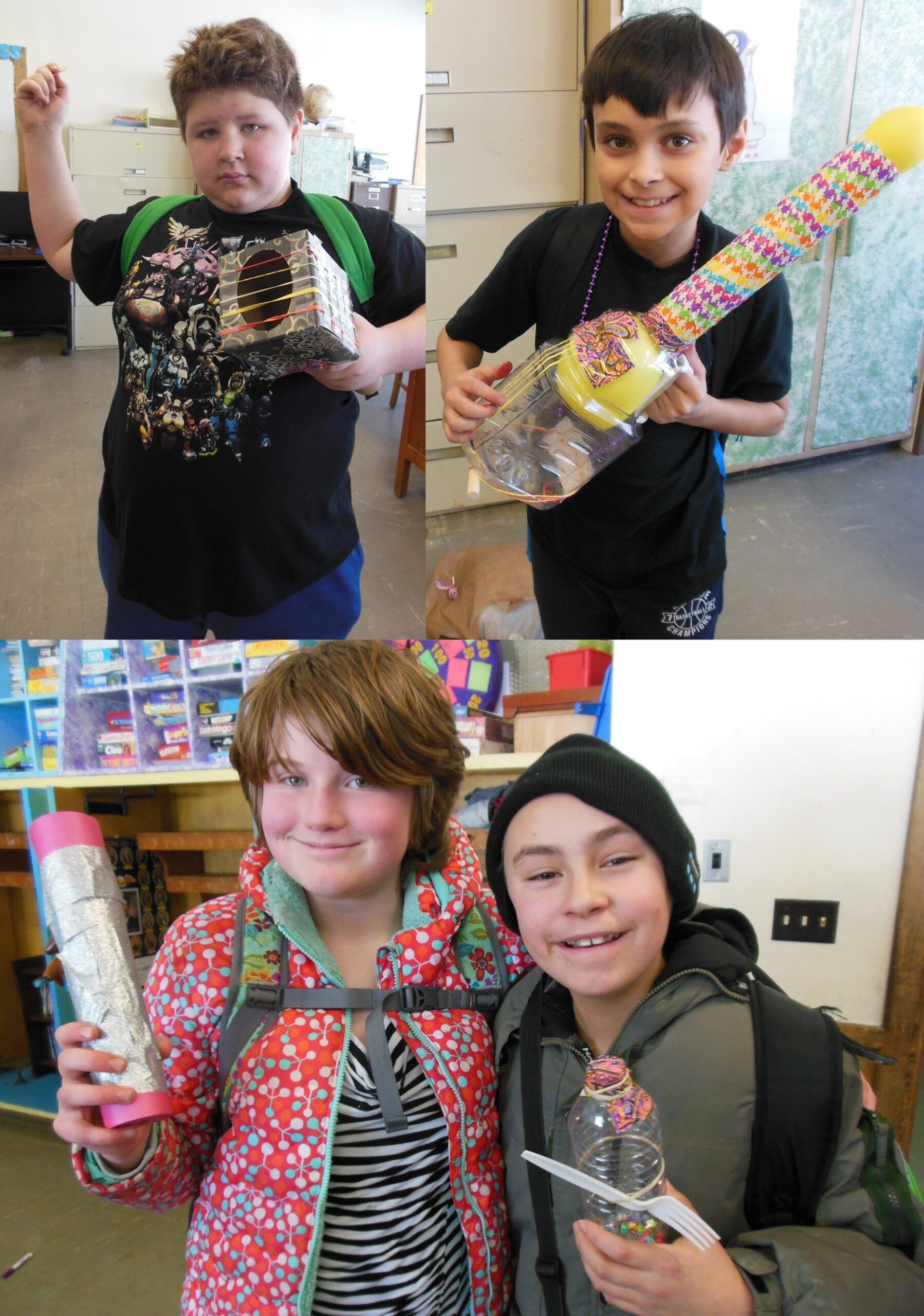 Ms. Christie’s class at Caldwell Elementary showing off their self-made instruments from recycled materials this week! This was part of a combined music & art group with Ms. April and Ms. Jessica. The kids had a lot of fun making shakers, rainsticks, guitars and microphones from all kinds of recycled materials.